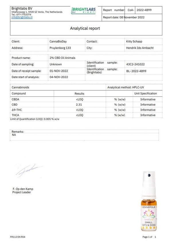 De populariteit van hennepolie neemt snel toe met als gevolg dat het bijna overal te koop is. Helaas is het onmogelijk om een flesje hennepolie tegen het licht te houden om te zien of het de actieve stoffen bevat. Alle hennepolie van CannaBioDay worden uitvoerig in een laboratorium getest om de kwaliteit te waarborgen. Hierdoor hebben de flesjes een batchnummer waardoor u zelf het analyse lab-rapport kunt inzien.