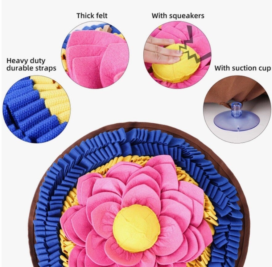 Kenmerken: Dichte, duurzame, sterke singels tegen bijten Aantrekkelijke primaire kleuren om de zichtbaarheid voor hoektanden te verbeteren Lotus ontworpen om de complexiteit bij het snuiven en foerageren te vergroten Verwijderbare bal in het midden is bevestigd met klittenband om complexiteit te verminderen De grote zuignap aan de onderkant om te bevestigen aan schone gladde vloeren 10 minuten snuffelmatactiviteit komt overeen met 1 uur hardlopen, het vermoeit uw huisdier Werkt ook als een slowfeeder.